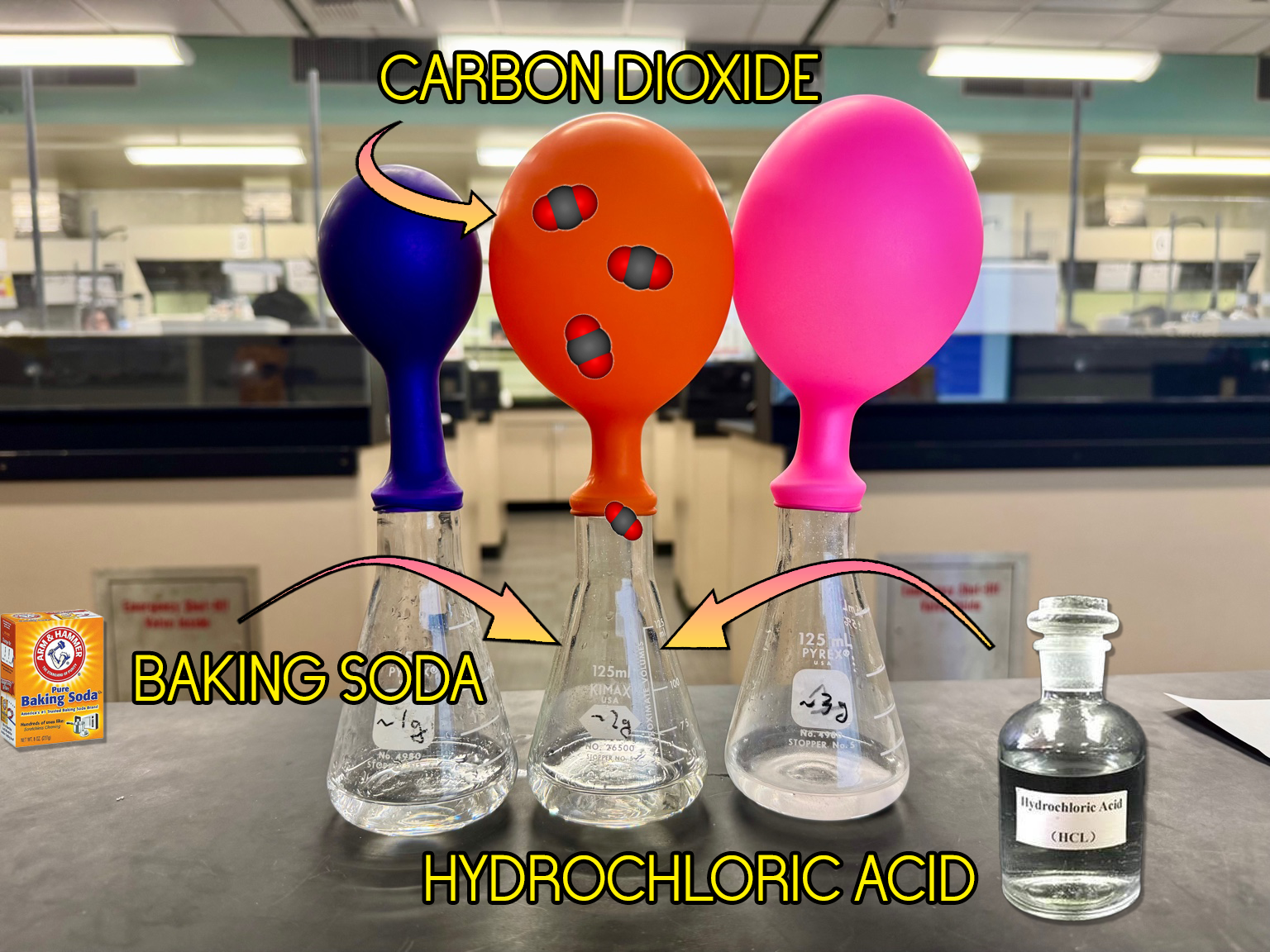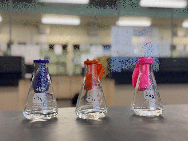 In the first two samples, increasing the mass of NaHCO₃ caused visibly larger balloons—students could see that more reactant produced more gas. However, by the third flask (~3 g NaHCO₃), the balloon no longer expanded further. Despite having more solid present, the reaction stopped once all available HCl had been consumed, showing that the acid became the limiting reactant.
