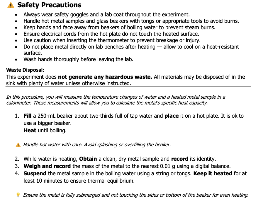 When I began teaching CHEM V101 (formerly V20L), I noticed that some parts of the existing lab manual could be clearer or more consistent. The manual worked well overall, but as I used it repeatedly, small differences in layout, tone, and structure became more noticeable. Below are some of the areas where I saw potential for improvement in readability, organization, and digital usability: