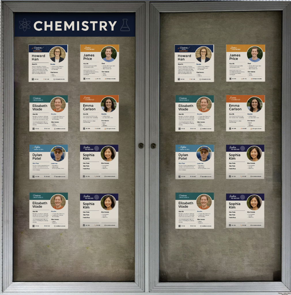 We transformed an underused hallway display case into a Chemistry faculty introduction board to improve visibility, student–faculty connection, and division branding. The goal was a clean, durable, and updatable board that highlights each instructor’s profile alongside quick-access links for students.